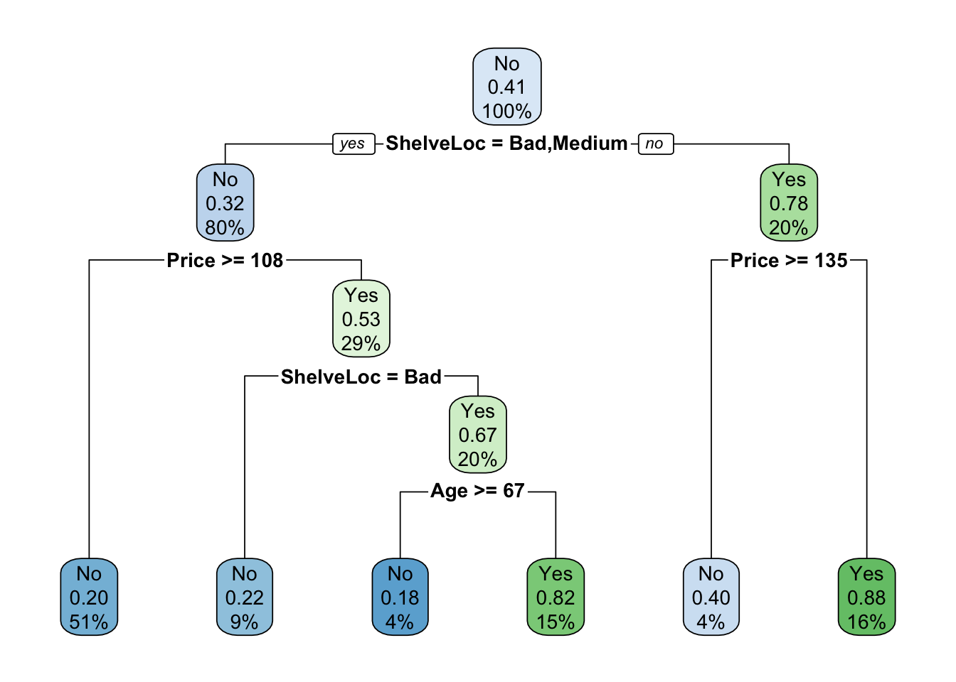 mod.tree <- rpart(High ~ . - Sales, data = carseats) # could alternatively use tree